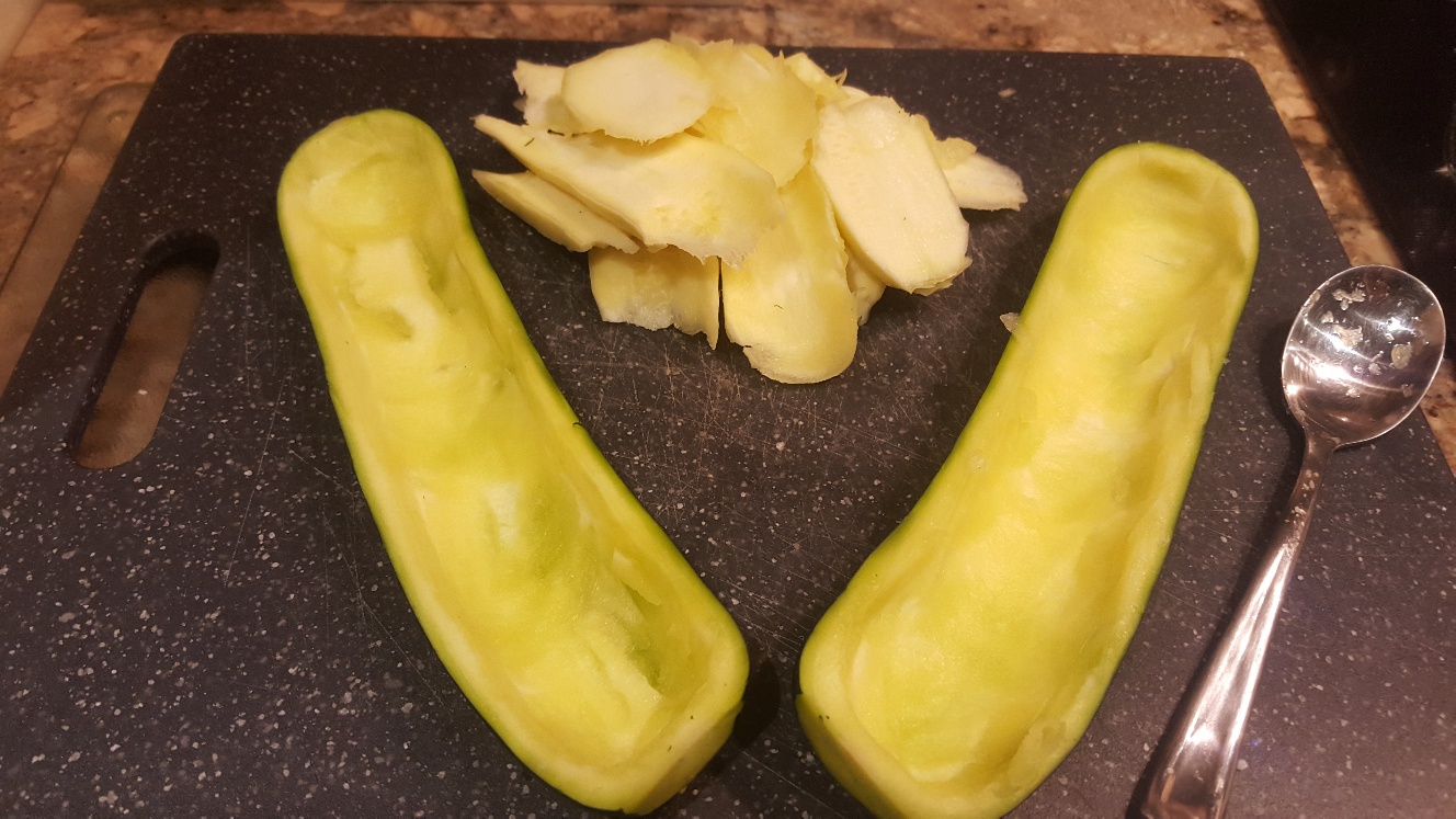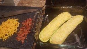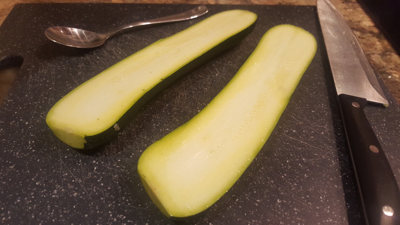 - Slice lengthwise your zucchini (washed and dried). Laying the halves on their side with interior facing up, scoop out the flesh of the zucchini until you have a semi-thin wall of skin creating your boat. Chop the scooped out zucchini flesh and set aside. Place your freshly made boats into your baking dish/tray.