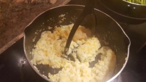 - Add the butter, cream cheese & half of the shredded cheese (saving the other half for later) to the pot. Continue to mash these into your mixture.