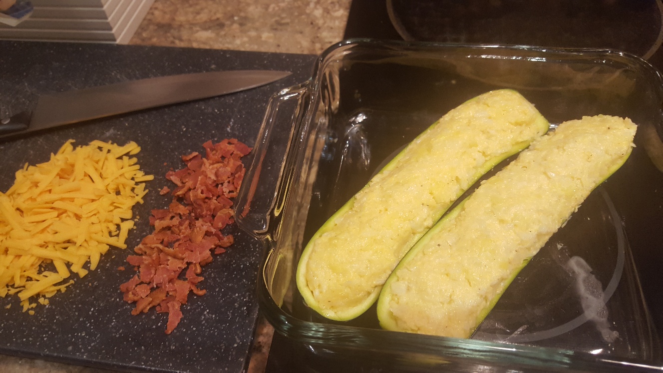 - Divide your mash evenly between the 2 zucchini boats, filling them entirely (any extra mash makes a nice snack for the chef!). Top your boats with the other half of the cheddar cheese and the crumbled bacon.