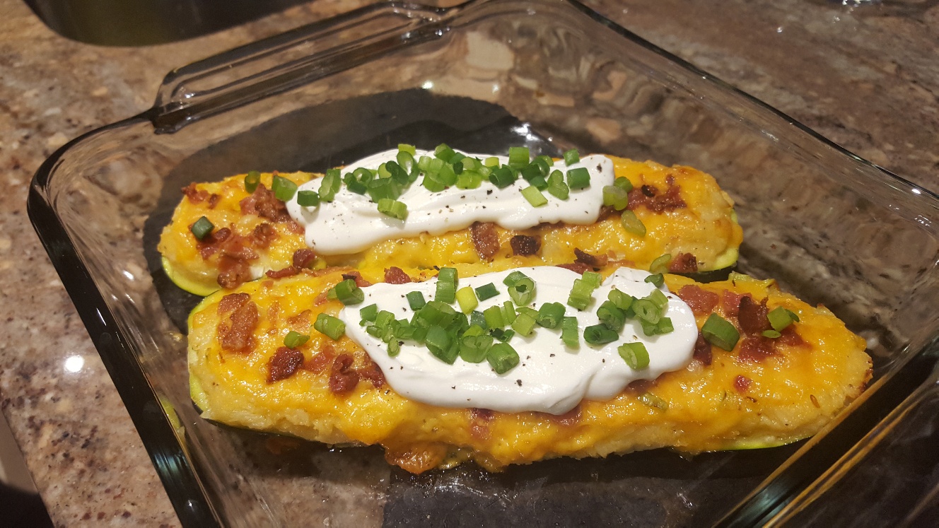 I love potatoes, do you love potatoes? My personal favourite is a baked potato that has been mixed with butter and cheese, twice baked and loaded with all of the fixings. Unfortunately the amount of carbs and calories that come along with this treat are extremely high; definitely not conducive with the typical low calorie diet or those striving to be in Keto or eat low carb. I have tried a few different takes on alternates and found this particular one to be my absolute favourite, it uses a zucchini to be the “boat” to keep it all together and the mash is mostly cauliflower which gives it that dense creamy texture. For a massive serving it is only 9 net carbs (big improvement to the 50g carbs found in a twice baked potato – ie. The Keg), and provides more protein and beneficial nutrients … not to mention it tastes amazing!!!